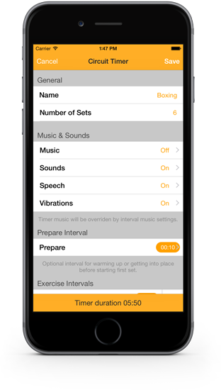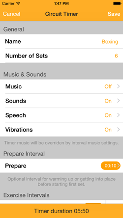 Circuit Training Interval Timer is simple but very flexible timer used for circuit training. It meets the needs of amateurs as well as professionals. User interface is designed to be clear and readable. Each timer can have unlimited number of exercise intervals and optional prepare, cooldown, rest between exercises and rest between sets intervals. For notification can be used vibrations, sounds and speech. No more looking at the screen to know current interval. Each interval has configurable name, duration, color and music. Music can be set also for whole timer.