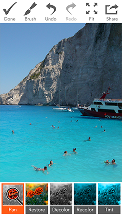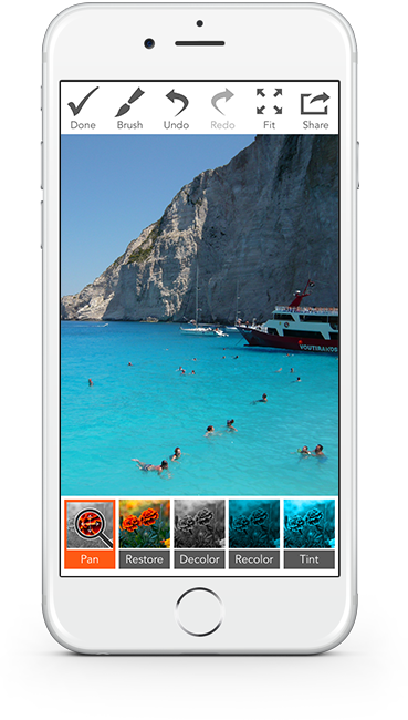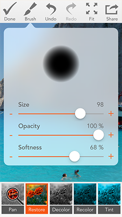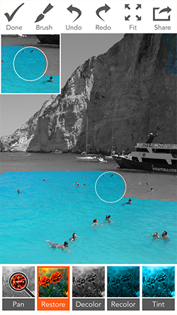 Restoring, removing or changing colors from parts of the image is done by stroking finger over the screen.