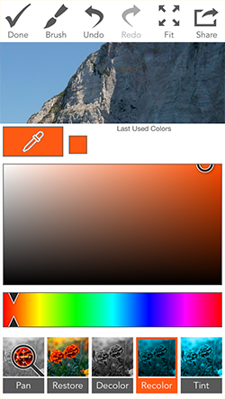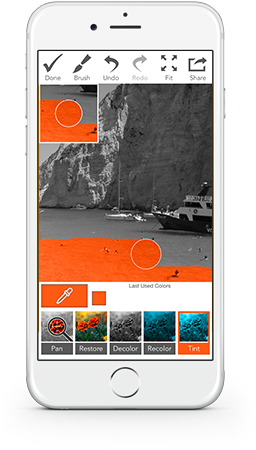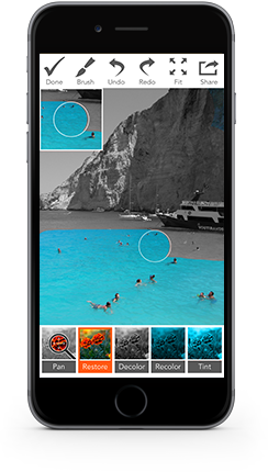 After you choose an image from the library or take a new one using the camera, the image will be converted to a grayscale image. You can restore or entirely change colors on desired parts of the image by stroking with your finger over them. There are four tools that you can use: Restore, Decolor, Recolor and Tint. Restore tool restores original image colors. Decolor tool removes colors from the image by converting them to grayscale. Recolor and Tint tools change image colors. The main difference between them is that the Tint tool preserves image luminance. Tint tool is good to change colors of darker parts of the image. Recolor tool is good to change colors of lighter parts of the image. After you are satisfied with your changes, you can save the image or share it.